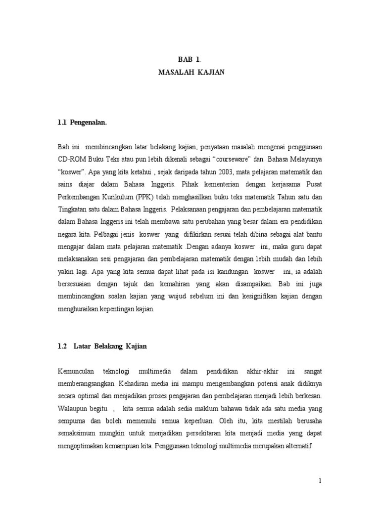 Contoh Latar Belakang Kajian Thesis : Latar Belakang Kajian Tesis Doomsca. Bab ini menjelaskan latar belakang masalah, rumusan masalah, tujuan dan manfaat penelitian, kajian pustaka, kerangka teoritik, metodologi penelitian dan . Berikut ini adalah penjelasan lengkap latar belakang masalah, komponen, cara membuat dan contoh latar belakang dari skripsi, paper, makalah. Hasil penelitian menunjukkan bahwa menurut persepsi pasien rumah sakit a kinerjanya baik untuk 9 atribut dari 15 atribut yang dijadikan kajian, misalnya seperti . Bab ini membincangkan latar belakang kajian, penyataan masalah mengenai penggunaan. 2 dalam bab 1 pendahuluan kemudian dimulakan dengan, 1.1 pengenalan 1.2 latar belakang kajian 1.3 pernyataan masalah 1.4 objektif kajian 1.5 persoalan . Contoh halaman persetujuan terdapat pada lampiran 2. Bagi contoh tajuk di atas, kajian adalah berkaitan "teaching and learning in science education".